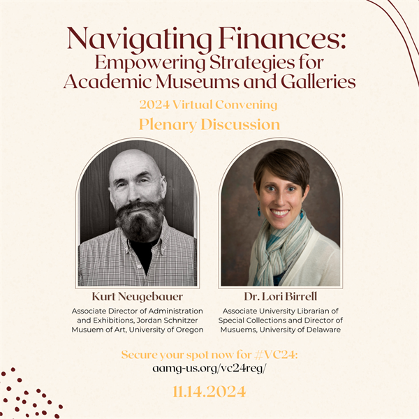 Shaking things up for this year's Virtual Convening, AAMG brings you a Plenary Discussion at the start of our day together. Focused on academic museum and gallery finances. we will hear from two members: Dr. Lori Birrell, Associate University Librarian of Special Collections and Director of Museums at the University of Delaware, and Kurt Neugebauer, Associate Director of Administration and Exhibitions at the Jordan Schnitzer Museum of Art (JSMA) at the University of Oregon. Together, Lori and Kurt will discuss methodologies and practices that keep their own institutional finances clear as well as open the conversation up for questions from the attendees for tips and tricks to aid you in your own positions. We know that many of us have varying levels of authority and access to our own budgets and we hope this conversation becomes a starting block to finding some commonalities and support from one another within our varying institutions.